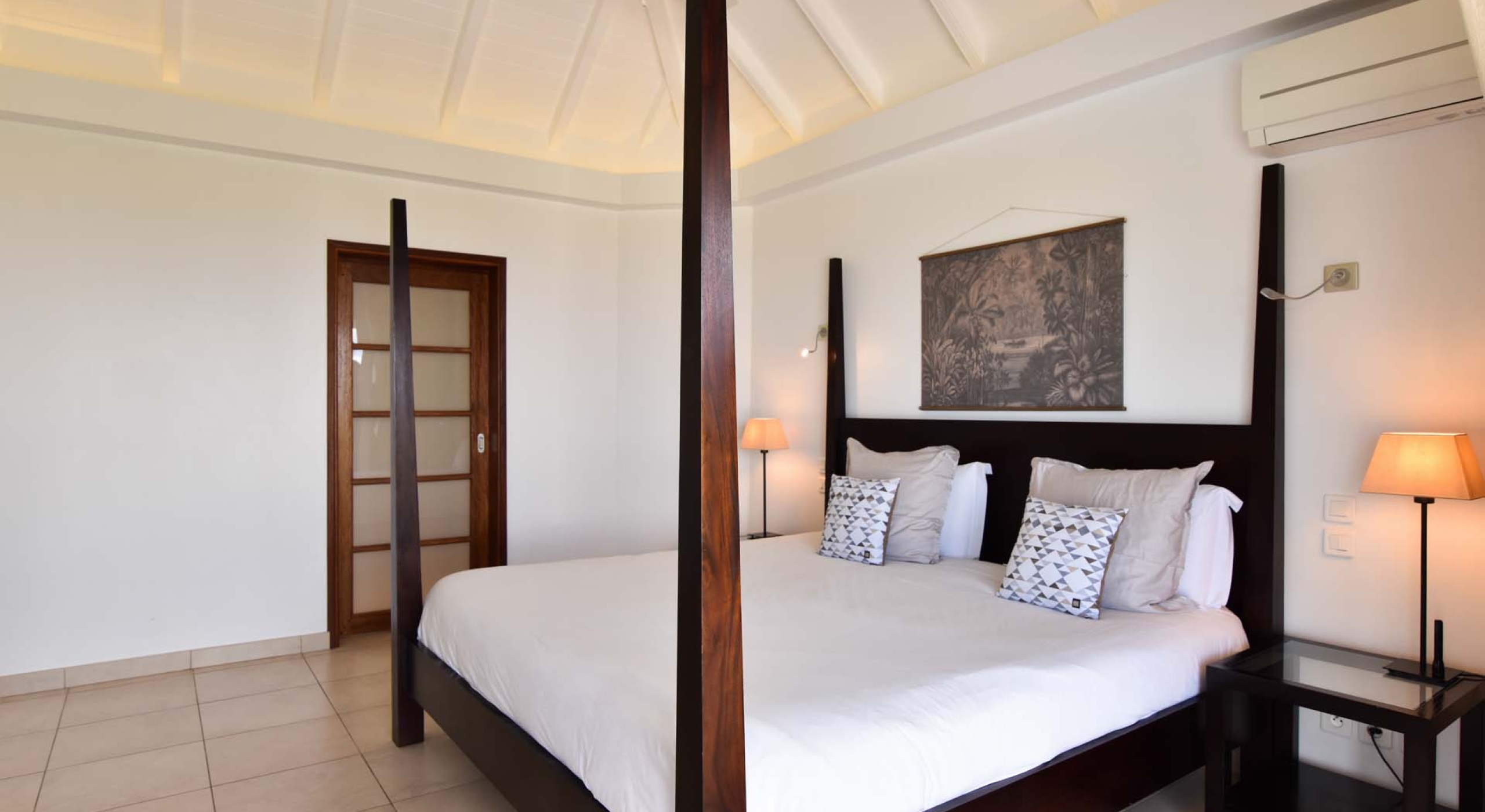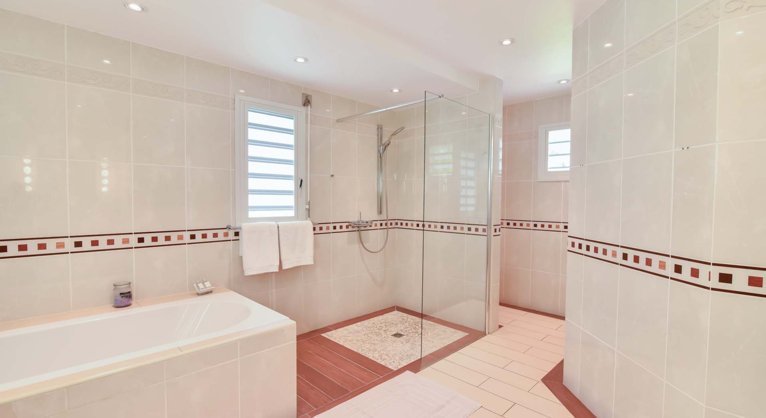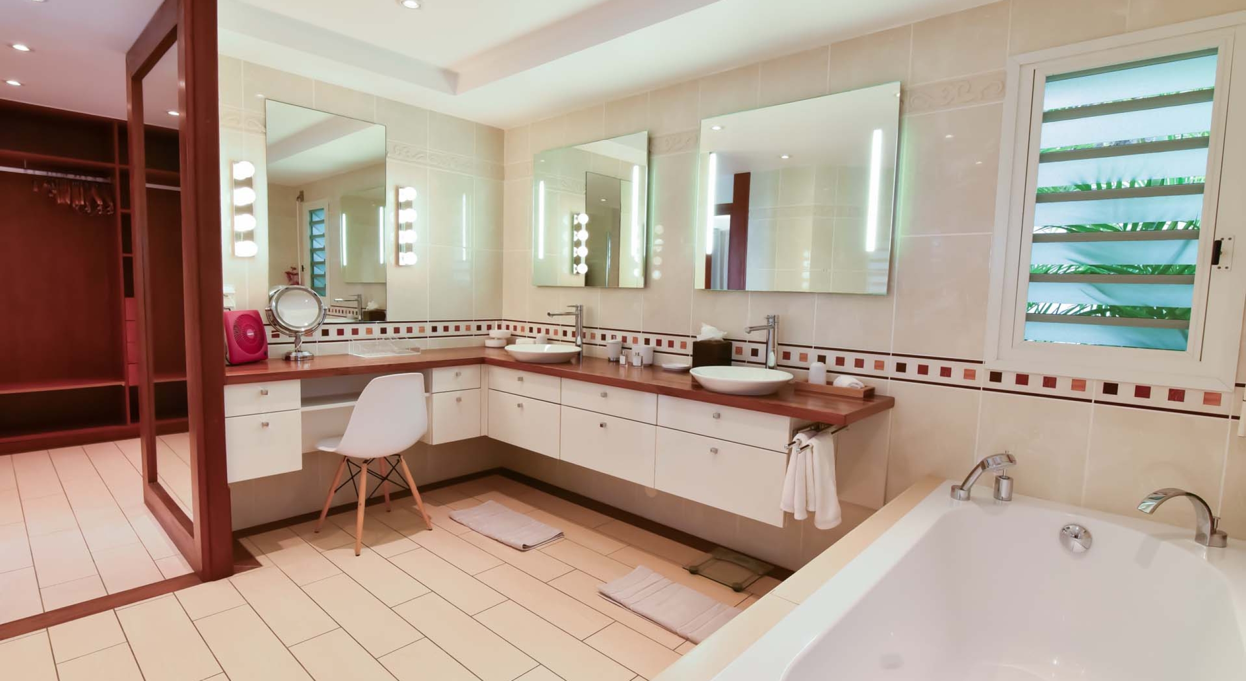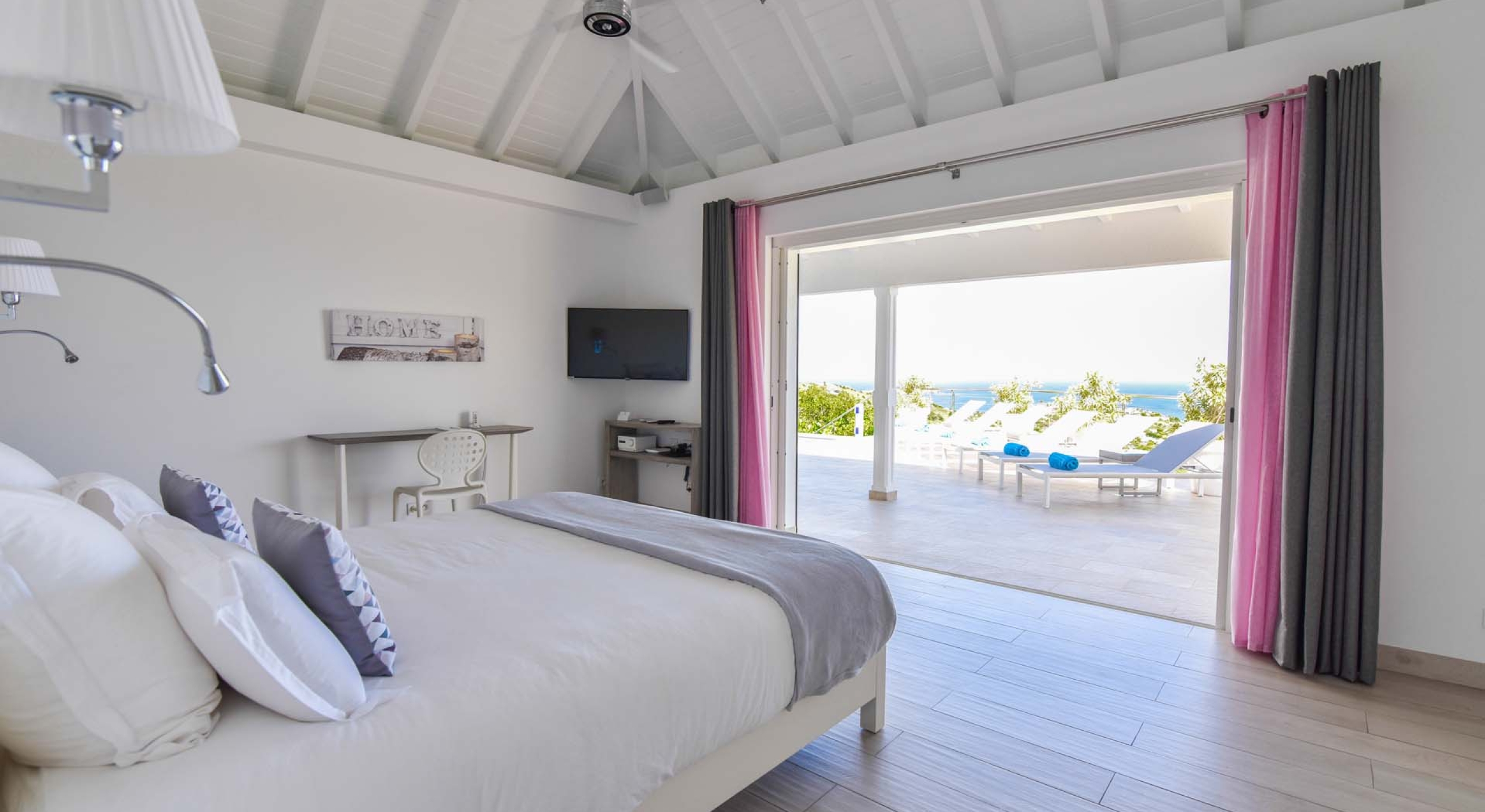 Villa Au Coeur du Rocher is home to three separate bedrooms, each beautifully decorated for maximum comfort and intimacy. Two bedrooms are stocked with King sized beds, air conditioning, fan, private save, television, satellite, DVD player, bathroom with bathtub and shower, large dresser for clothes, Apple TV and iPod dock. Each boasts a view of the Caribbean Sea and islands while one – located on the lower terrace – even has it’s own private terrace; perfect for a romantic moment alone!