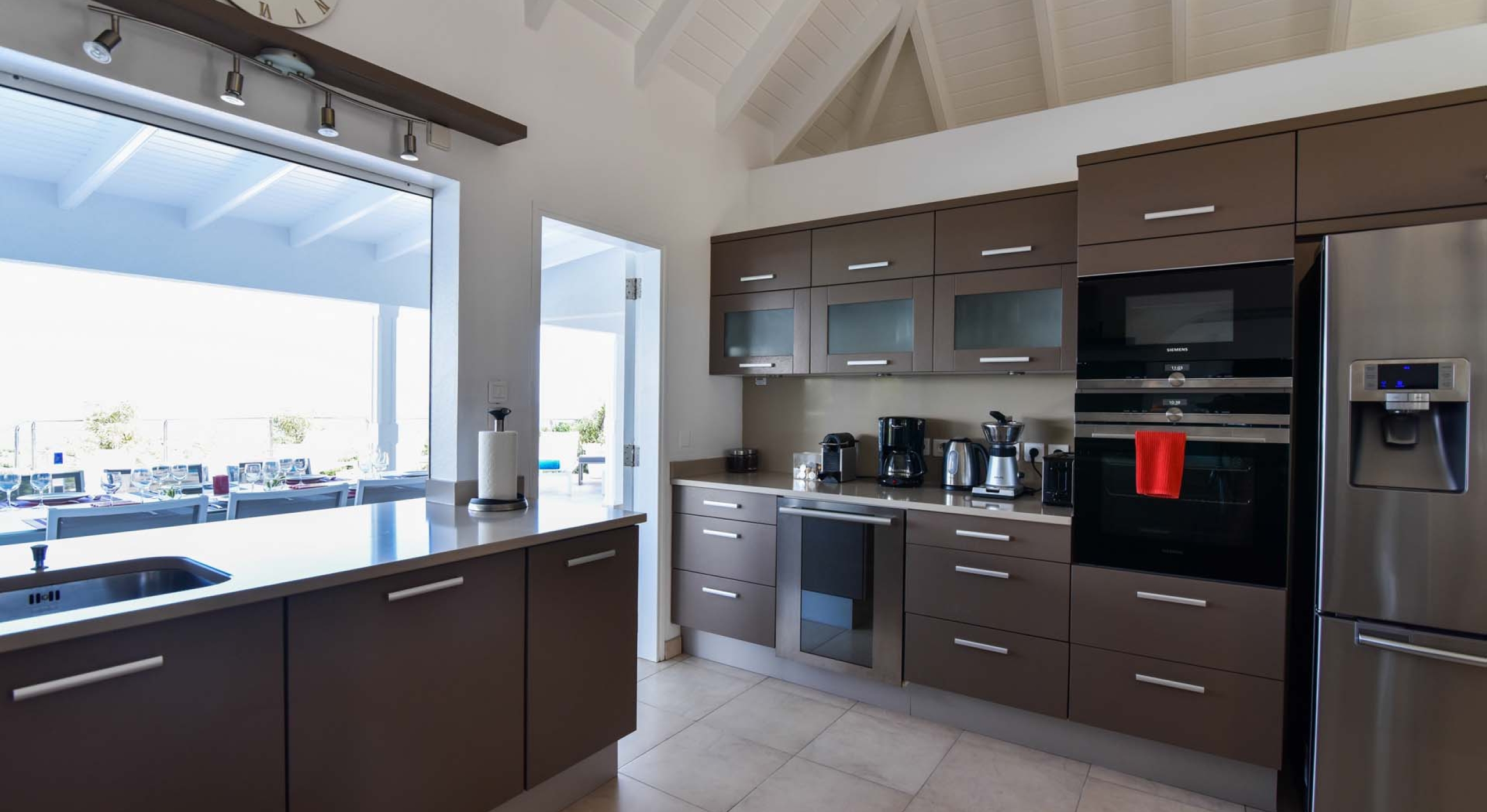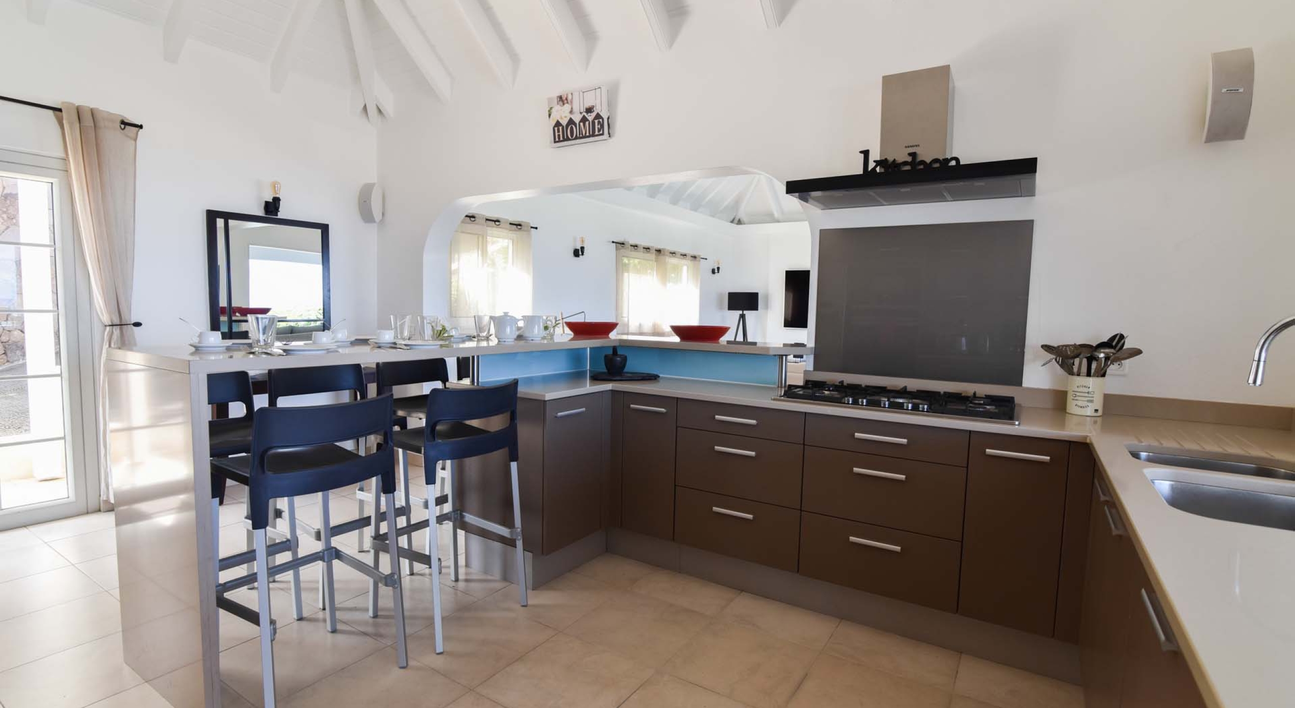 The living are of Villa Au Coeur du Rocher is beautifully decorated in modern, hip minimalist style, with strong colors and enough room for all to lounge in comfort, unwind by the television and enjoy each others company, basking in the glorious view of the Caribbean islands beyond. Complete with fan, television, Apple TV, Canalsat, satellite and iPod plug, this fully functional entertainment system offers a plethora of options to keep things fresh.
